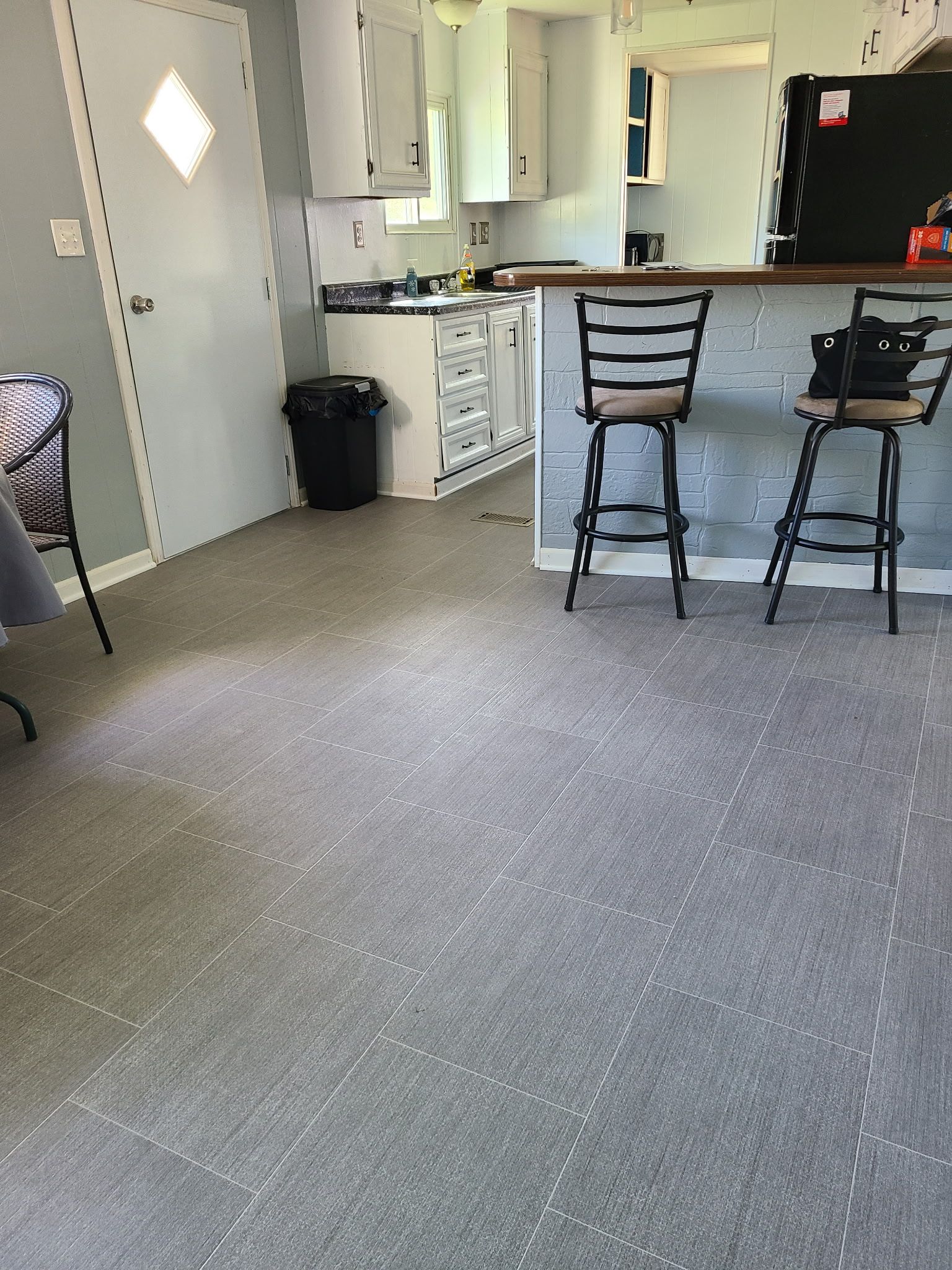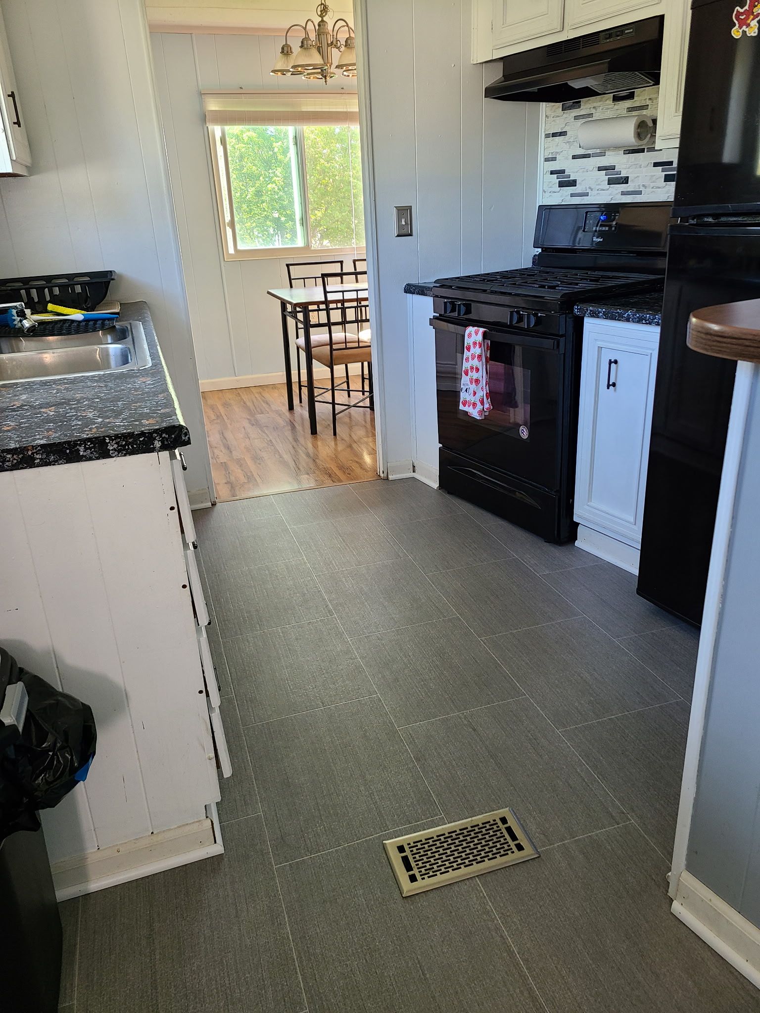 New subfloor and flooring in large bathroom and kitchen/dining room area April 2022